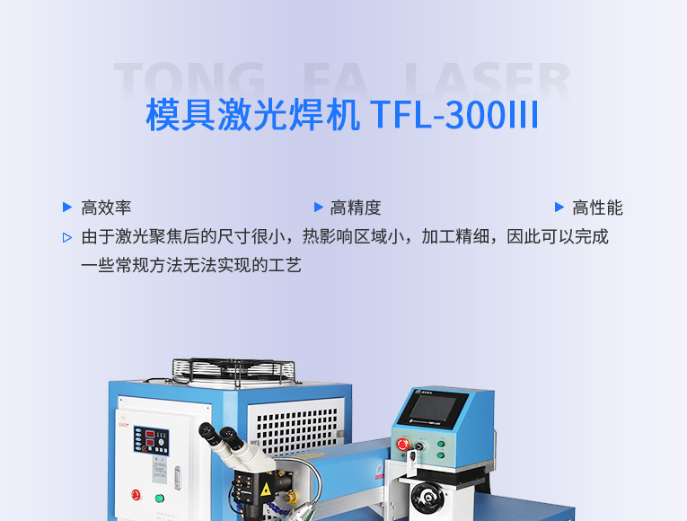 通發(fā)激光TFL-300Ⅲ大功率模具激光焊機(jī),比普通激光焊機(jī)修復(fù)模具效率快1.5-2倍,適合0.3-0.6激光焊絲,大功率更適合修復(fù)鈹銅模具、鋁模等較難修復(fù)的模具。